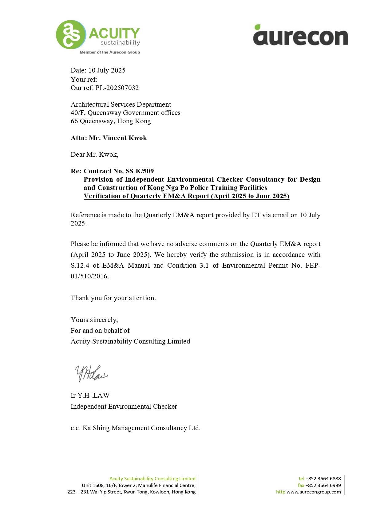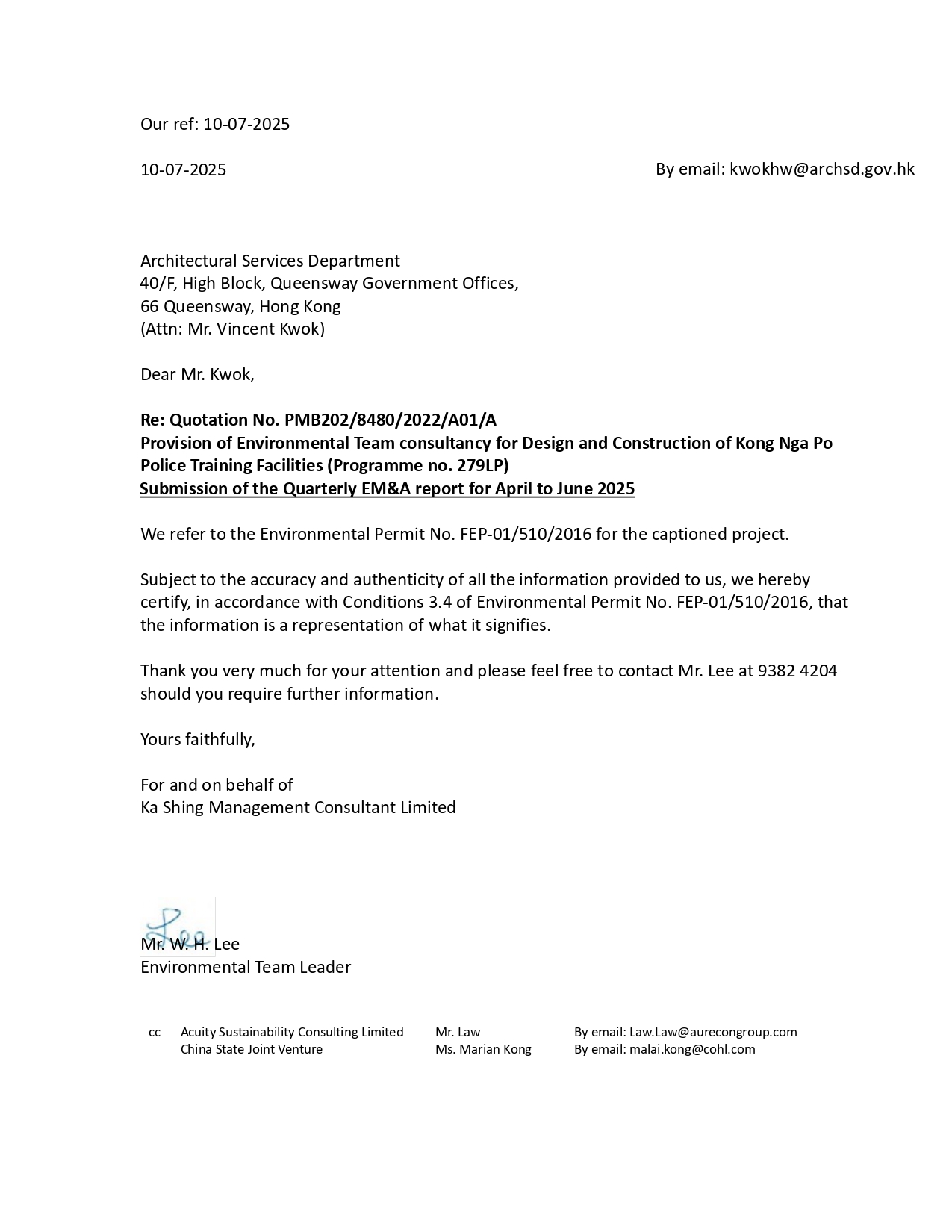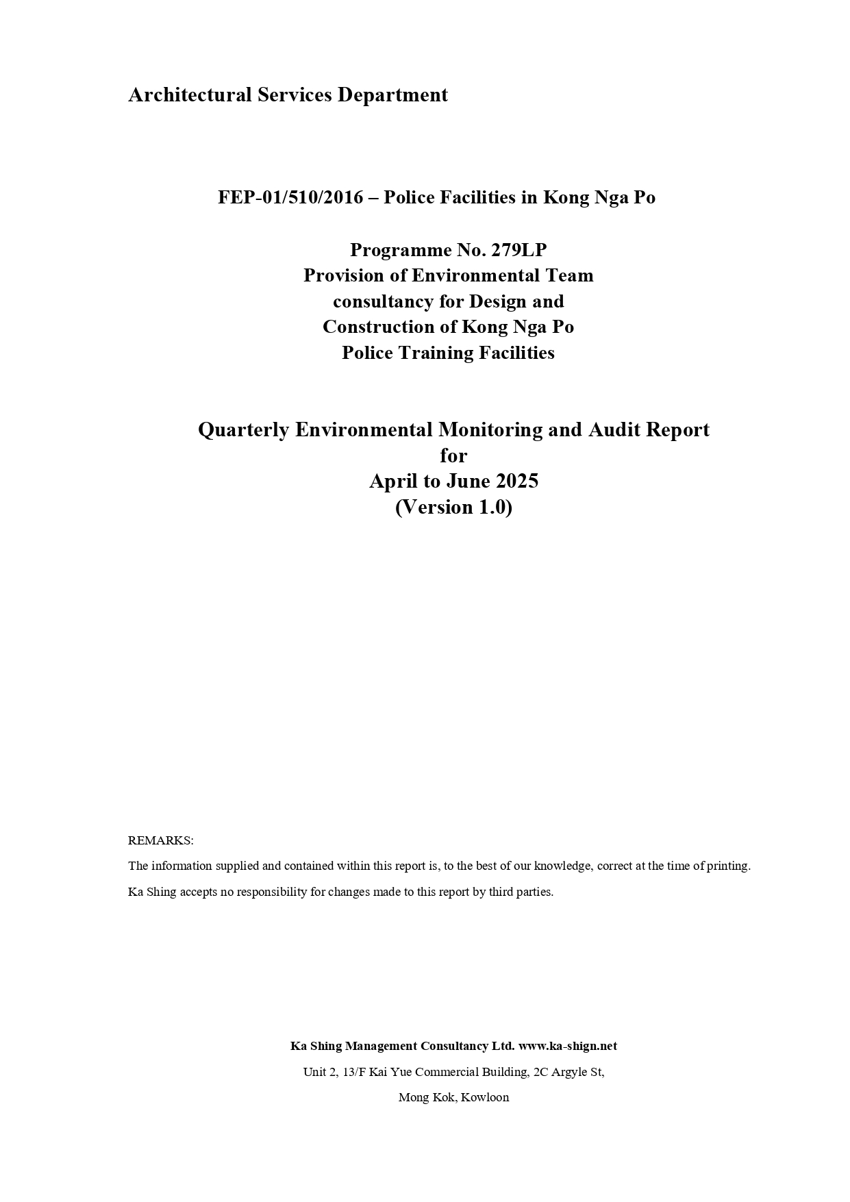 Quarterly EM&A Report presents the EM&A work undertaken from April to June 2025 in accordance